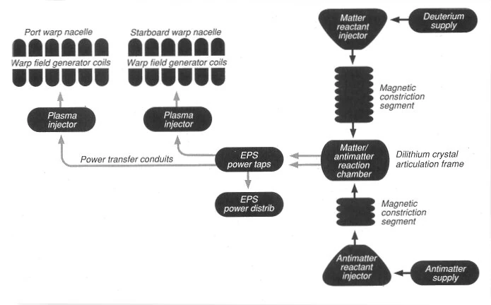 There are 2 sets of reactant injectors, these are similar to a cars fuel injectors. One is the Matter Reactant Injector (MRI). The other is the Antimatter Reactant Injector (ARI). The MRI takes in Sub-Zero cold Deuterium from the Primary Deuterium Tankage (PDT) and then heats it up to a gas. The MRI itself is constructed of Dispersion-Strengthened Woznium Carbmolybdenide. In dealing with antimatter many precautions must be taken because if some were to mix with normal matter outside of the chamber, there would be an explosion that would make the atomic bomb look like a sparkler. The MRI and ARI are basically the same except that the ARI uses Antihydrogen and dealt with in smaller amounts. Also, the ARI uses magnetic fuel paths to control the antihydrogen.